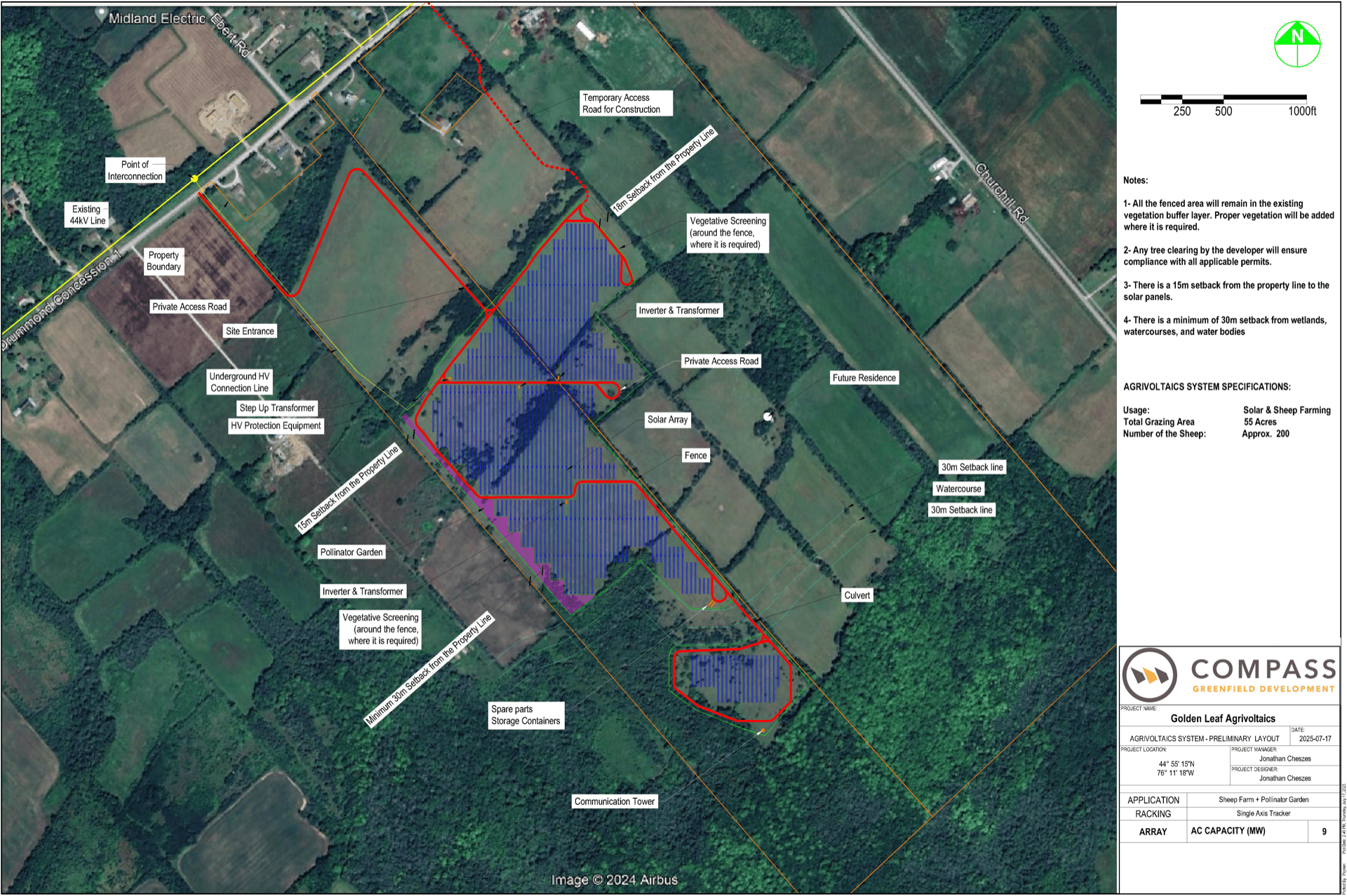 The Project proposes to co-locate solar—up to 9.5 Mega-Watt AC (“MWac”)—and agriculture on the same land within the Township of Drummond/North Elmsley, under development by Compass Greenfield Development Inc. The Project will participate in contributing to the 75% increase in energy demand by 2050 in ON through the IESO’s LT2 RFP bid submission in Q3 of 2025. This infrastructure project will bring significant investment and local benefits including employment, lease payments and capital spending in the local economy.